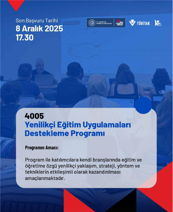Toplumda bilim kültürünün ve iletişiminin geliştirilmesini amaçlayan Bilim ve Toplum Başkanlığı tarafından yürütülen “4005 Yenilikçi Eğitim Uygulamaları Destekleme Programı” 2025 yılı çağrısı yayınlanmıştır.